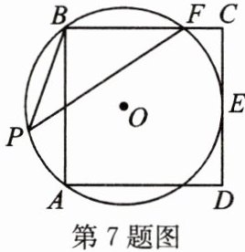 7. 如图,$ E $ 为正方形 $ ABCD $ 的边 $ CD $ 的中点,经过 $ A $,$ B $,$ E $ 三点的 $ \odot O $ 与边 $ BC $ 交于点 $ F $,$ P $ 为 $ \overset{\frown}{AB} $ 上任意一点. 若正方形 $ ABCD $ 的边长为 $ 4 $,求 $ \sin ∠ BPF $ 的值.