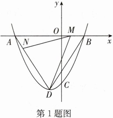 1. 如图,二次函数 $ y = \frac{1}{2}x^2 + bx - 4 $ 的图像与 $ x $ 轴相交于点 $ A(-4,0) $ 和点 $ B $,与 $ y $ 轴相交于点 $ C $,顶点为 $ D $,连接 $ AD $,$ BD $,点 $ M $,$ N $分别在线段 $ AB $,$ AD $ 上(均含端点),且 $ ∠ DMN = ∠ DBA $,若 $ △ DMN $ 是等腰三角形,则点 $ M $ 的坐标为