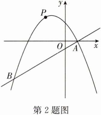 2. 如图,在平面直角坐标系中,直线 $ y = \frac{1}{2}x - 1 $ 与抛物线 $ y = -\frac{1}{4}x^2 + bx + c $ 交于 $ A $,$ B $ 两点,点 $ A $ 在 $ x $ 轴上,点 $ B $ 的横坐标为 $ -8 $,$ P $ 是直线 $ AB $ 上方抛物线上的一个动点(不与点 $ A $,$ B $ 重合). 连接 $ PA $,$ PB $,在点 $ P $ 运动过程中,是否存在某一位置,使 $ △ PAB $ 恰好是一个以 $ P $ 为直角顶点的等腰直角三角形?若存在,求出点 $ P $ 的坐标;若不存在,请说明理由.