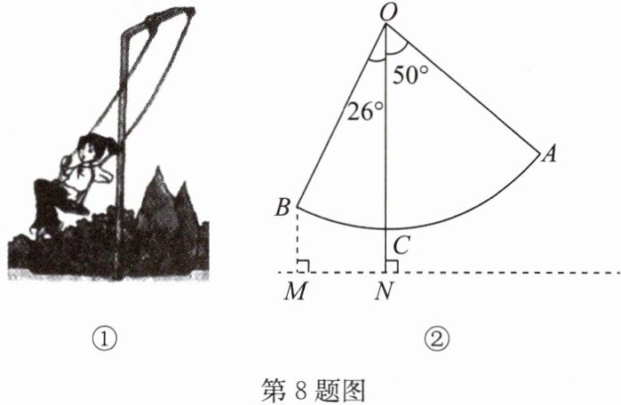 8. (2023·达州)莲花湖湿地公园是当地人们喜爱的休闲景区之一,里面的秋千(如图①)深受孩子们喜爱.如图②所示,秋千链子的长度为3m,当摆角$∠ BOC$恰为$26^{\circ}$时,座板离地面的高度$BM$为0.9m,当摆动至最高位置时,摆角$∠ AOC$为$50^{\circ}$,求座板离地面的最大高度为多少米?(结果精确到0.1m,参考数据:$\sin26^{\circ}\approx0.44$,$\cos26^{\circ}\approx0.9$,$\tan26^{\circ}\approx0.49$,$\sin50^{\circ}\approx0.77$,$\cos50^{\circ}\approx0.64$,$\tan50^{\circ}\approx1.2$)