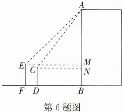 6. (2024·深圳)如图,为了测量某电子厂的高度,小明用高1.8m的测量仪$EF$测得顶端$A$的仰角为$45^{\circ}$,小军在小明的前面5m处用高1.5m的测量仪$CD$测得顶端$A$的仰角为$53^{\circ}$,则电子厂$AB$的高度为(参考数据:$\sin53^{\circ}\approx\frac{4}{5}$,$\cos53^{\circ}\approx\frac{3}{5}$,$\tan53^{\circ}\approx\frac{4}{3}$) (