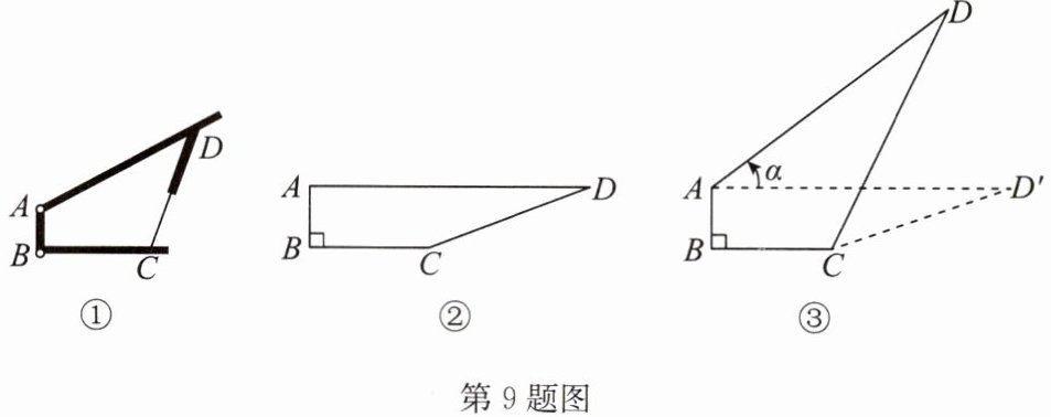 9. (2024·苏州)图①是某种可调节支撑架,$BC$为水平固定杆,竖直固定杆$AB⊥ BC$,活动杆$AD$可绕点$A$旋转,$CD$为液压可伸缩支撑杆,已知$AB = 10$cm,$BC = 20$cm,$AD = 50$cm.