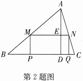 2. 如图,张师傅有一块锐角三角形木料 $ ABC $,其中 $ BC = 120 \mathrm{ mm} $,高 $ AD = 80 \mathrm{ mm} $,张师傅想把它加工成矩形零件 $ PQMN $,使一边在 $ BC $ 上,其余两个顶点分别在边 $ AB $,$ AC $ 上,$ PQ $ 与 $ AD $ 交于点 $ H $.