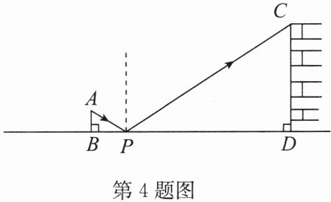 4. 如图是一位同学设计的用手电筒来测量某古城墙高度的示意图.点 $ P $ 处放一水平的平面镜,光线从点 $ A $ 发出经平面镜反射后刚好到古城墙 $ CD $ 的顶端 $ C $ 处,已知 $ AB ⊥ BD $,$ CD ⊥ BD $,测得 $ AB = 2 $ 米,$ BP = 3 $ 米,$ PD = 15 $ 米,求该古城墙 $ CD $ 的高度.