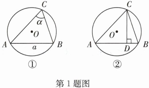 1. 如图①,$\odot O$的半径为$r$,$△ ABC$是$\odot O$的内接三角形。