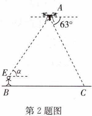 2. 随着科学技术的不断进步,无人机被广泛应用到实际生活中,小星利用无人机来测量广场 B,C 两点之间的距离. 如图所示,小星站在广场的 B 处遥控无人机,无人机在 A 处距离地面的飞行高度是 41.6 m,此时从无人机测得广场 C 处的俯角为$63^{\circ}$,他抬头仰视无人机时,仰角为$α$,若小星的身高$BE=1.6\ \mathrm{m}$,$EA=50\ \mathrm{m}$(点 A,E,B,C 在同一平面内).