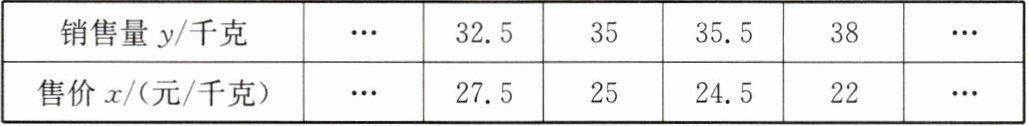 19. 某水果店购进一批优质芒果,进价为 10 元/千克,售价不低于 15 元/千克,且不超过 40 元/千克.根据销售情况,发现该芒果在一天内的销售量 $ y $(千克)与该天的售价 $ x $(元/千克)满足如下表所示的一次函数关系.