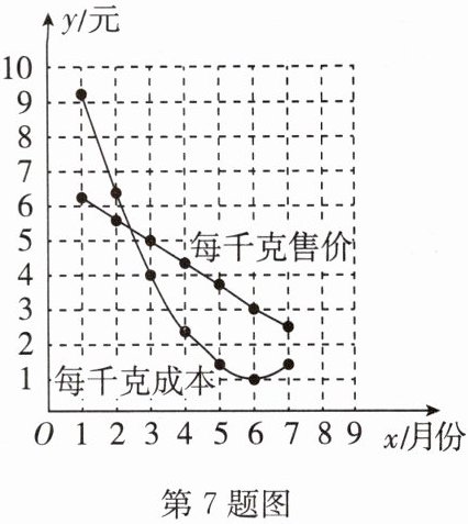 7. 在 1~7 月份,某地的蔬菜批发市场指导菜农生产和销售某种蔬菜,并向他们提供了这种蔬菜每千克售价与每千克成本的信息如图所示,则出售该种蔬菜每千克利润最大的月份可能是