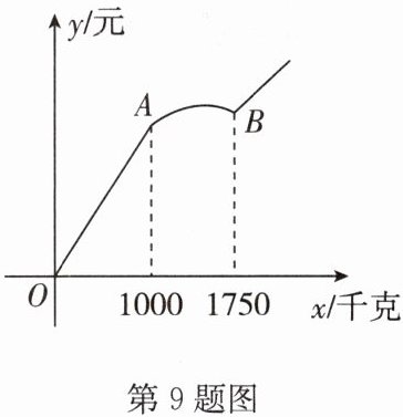 9. (2023·泰州)某公司的化工产品成本为 30 元/千克.销售部门规定:一次性销售 1000 千克以内时,以 50 元/千克的价格销售;一次性销售不低于 1000 千克时,每增加 1 千克降价 0.01 元.考虑到降价对利润的影响,一次性销售不低于 1750 千克时,均以某一固定价格销售.一次性销售利润 $ y $ (元)与一次性销售量 $ x $ (千克)的函数关系如图所示.