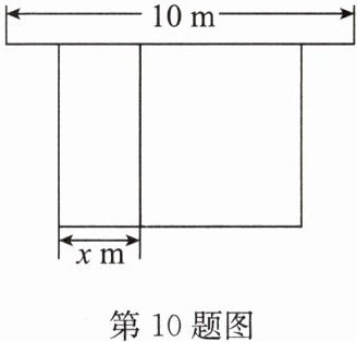 10. 某农场计划建造一个矩形养殖场,为充分利用现有资源,该矩形养殖场一面靠墙(墙的长度为 10 m),另外三面用栅栏围成,中间再用栅栏把它分成两个面积为 $ 1:2 $ 的矩形,已知栅栏的总长度为 24 m,设较小矩形的宽为 $ x\ \mathrm{m} $ (如图).