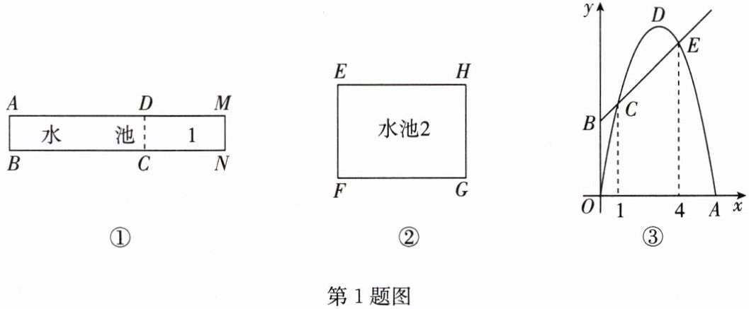 为美化校园环境,某学校根据地形情况,要对景观带中一个长$AD = 4$m,宽$AB = 1$m的矩形水池$ABCD$进行加长改造(如图①,改造后的水池$ABNM$仍为矩形,以下简称水池1),同时,再建造一个周长为12m的矩形水池$EFGH$(如图②,以下简称水池2).