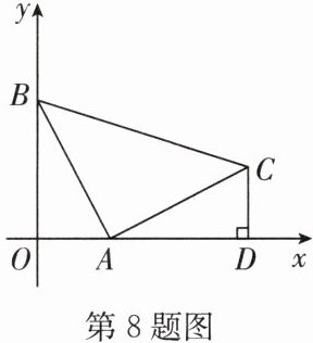 8. 如图,直线 $ y = -2x + 2 $ 与 $ x $ 轴,$ y $ 轴分别交于点 $ A,B $,以线段 $ AB $ 为直角边在第一象限内作等腰直角 $ △ ABC $,$ ∠ BAC = 90^{\circ} $,过点 $ C $ 作 $ CD ⊥ x $ 轴,垂足为 $ D $,则过 $ B,A,D $ 三点的抛物线的函数表达式为