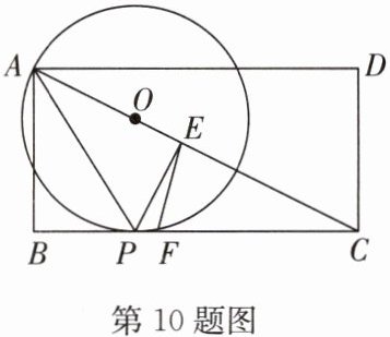 10. 如图,在矩形 ABCD 中,$ CD = 2 $,$ AD = 4 $,点 P 在 BC 上,将$△ ABP$沿 AP 折叠,点 B 恰好落在对角线 AC 上的点 E 处,O 为 AC 上一点,$\odot O$经过点 A,P.