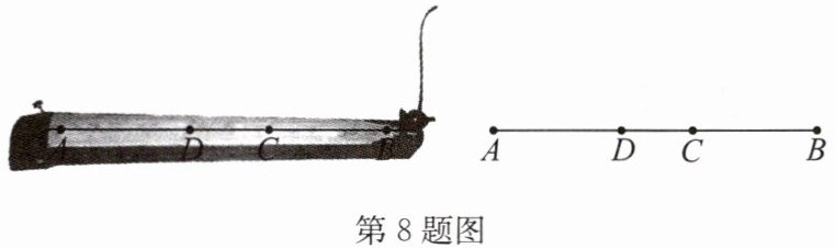 8. (2023·达州)如图,乐器上的一根弦 $ AB = 80 $ cm,两个端点 A,B 固定在乐器面板上,支撑点 C 是靠近点 B 的黄金分割点,支撑点 D 是靠近点 A 的黄金分割点,则支撑点 C,D 之间的距离为