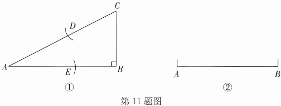 11. (1)如图①,在 $ \mathrm{Rt}△ ABC $ 中,$ ∠B = 90^{\circ} $,$ AB = 2BC $,先以点 C 为圆心,CB 的长为半径画弧交边 AC 于点 D,再以点 A 为圆心,AD 的长为半径画弧交边 AB 于点 E. 求证:$\frac{AE}{AB}=\frac{\sqrt{5}-1}{2}$;(这个比值$\frac{\sqrt{5}-1}{2}$叫做 AE 与 AB 的黄金比)