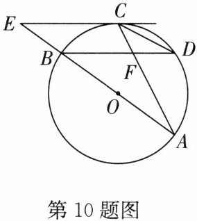 10. 如图,在$ \odot O $中,$ AB $为直径,$ BD $为弦,$ C $为$ \overset{\frown}{BD} $的中点,以$ C $为切点的切线与$ AB $的延长线交于点$ E $. 若$ \frac{CF}{AF}=\frac{1}{3} $,求$ \frac{CE}{AE} $的值.