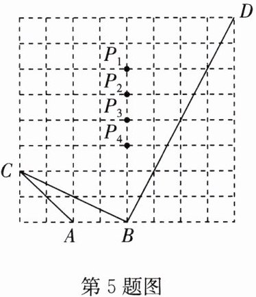 5. 如图,在正方形网格中,若$△ ABC ∽ △ PBD$,则点$P$应在(