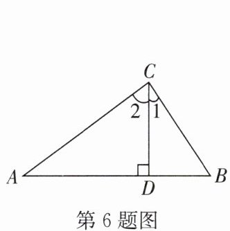 6. 如图,在△ABC 中,CD⊥AB 于点 D,有下列条件:①∠1=∠A;②$\frac{CD}{AD}=\frac{DB}{CD}$;③∠B+∠2=90°;④BC:AC:AB=3:4:5;⑤AC·BD=BC·CD.其中一定能确定△ABC 为直角三角形的条件的个数是(