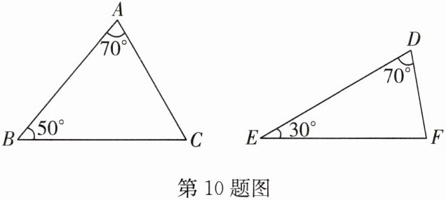10. 如图,在△ABC 和△DEF 中,已知∠A=∠D=70°,∠B=50°,∠E=30°,作直线 l 和直线 m,使直线 l 将△ABC 分成两个小三角形,使直线 m 将△DEF 分成两个小三角形,并使△ABC 分成的两个小三角形与△DEF 分成的两个小三角形分别相似.(画一种分割方法即可,标出小三角形中各内角的度数)