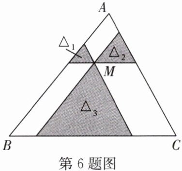 6. (2024·泰州模拟)如图,$M$是$△ ABC$内一点,过点$M$分别作直线平行于$△ ABC$的各边,所形成的三个小三角形$△_1$,$△_2$,$△_3$(图中阴影部分)的面积分别是$4$,$9$和$49$,则$△ ABC$的面积是(