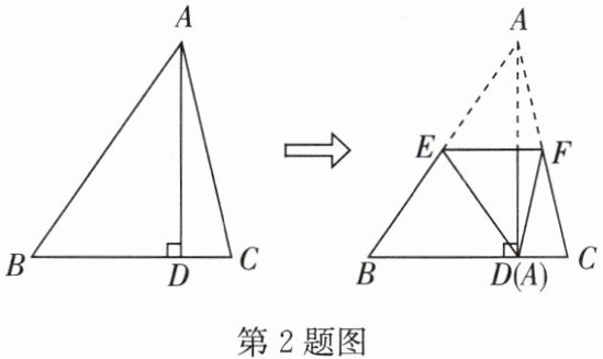 2. 在$△ ABC$中,$AB = 12$,$AC = 10$,$BC = 9$,$AD$是$BC$边上的高。将$△ ABC$按如图所示的方式折叠,使点$A$与点$D$重合,折痕为$EF$,则$△ DEF$的周长为(