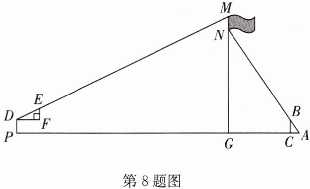 8. (2024·滨湖区期中)为了测量学校旗杆上旗帜的宽度 MN,如图,点 P,G,C,A 在同一水平直线上,$MG⊥ PA$,先是小红在点 C 处竖立一根标杆 $BC(BC⊥ PA)$,地面上的点 A,标杆顶端 B 和点 N 在一条直线上(点 N 在 MG 上),$BC = 1.5$ 米,$AC = 1$ 米,$AG = 8$ 米;然后小明在点 P 处手持自制直角三角形纸板 $DEF(DP⊥ PA)$,其中 $EF = 0.1$ 米,$DF = 0.2$ 米,使长直角边 DF 与水平地面平行,调整位置,恰好在点 P 时点 D,E,M 在一条直线上,$DP = 1.5$ 米,$PG = 23.6$ 米. 请你根据两次测量的结果,求旗帜的宽度 MN.