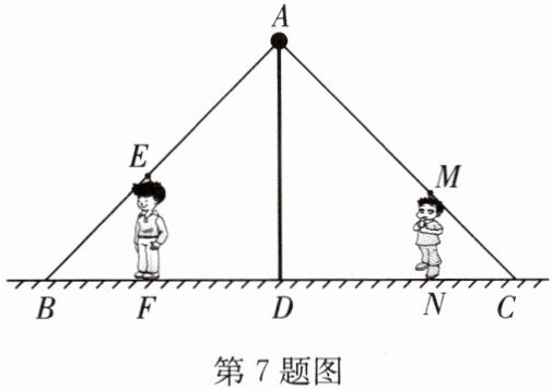 7. 如图,小强和小华同时站在路灯下,小强的身高 $EF = 1.8 m$,小华的身高 $MN = 1.5 m$,他们的影长恰好等于自己的身高,即 $BF = 1.8 m$,$CN = 1.5 m$,且两人相距 4.7 m,则路灯 AD 的高度是