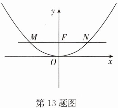 13. 如图,二次函数的图像顶点在原点,且点 $ (2,1) $ 在二次函数的图像上,过点 $ F(0,1) $ 作 $ x $ 轴的平行线交二次函数的图像于 $ M $,$ N $ 两点。