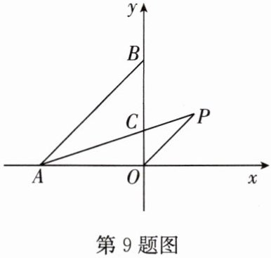9. (2023·梁溪区月考)如图,点$A$,$B$分别在$x$轴负半轴和$y$轴正半轴上,点$C$在$OB$上,$OC:OB = 1:3$,连接$AC$,过点$O$作$OP// AB$交$AC$的延长线于点$P$.若$P(1,1)$,则$\tan∠ ACO$的值是