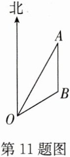 11. 如图,小岛$A$在港口$O$北偏东$30^{\circ}$的方向上,小岛$B$在小岛$A$的正南方,$OA = 60$海里,$OB = 20\sqrt{3}$海里。小岛$B$在港口$O$的