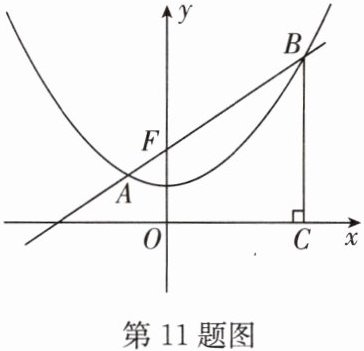 11. 如图,抛物线 $ y = a x ^ { 2 } + c $ 过点 $ ( - 2, 2 ) $,$ ( 4, 5 ) $,过定点 $ F ( 0, 2 ) $ 的直线 $ l : y = k x + 2 $ 与抛物线交于 $ A, B $ 两点,点 $ B $ 在点 $ A $ 的右侧,过点 $ B $ 作 $ x $ 轴的垂线,垂足为 $ C $.