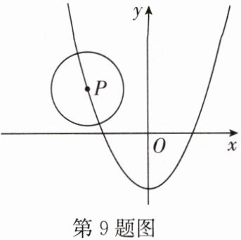 9. 如图,$ \odot P $ 的半径为 2,圆心 $ P $ 在抛物线 $ y = \frac { 1 } { 2 } x ^ { 2 } - 3 $ 上运动,当 $ \odot P $ 与 $ x $ 轴相切时,圆心 $ P $ 的坐标为