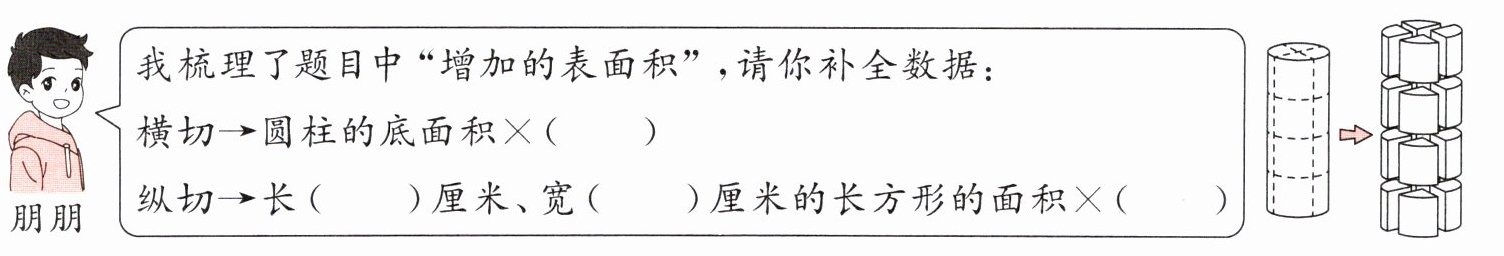 8. 【归纳总结】B C 【实践应用】6 16 6 4(画线部分答案不唯一) $3.14×(6÷2)^{2}×6+16×6×4=553.56$(平方厘米) 答:增加了553.56平方厘米。 解析 ●归纳总结:若按切法①操作,增加的表面积就是两个底面的面积,即$2π r^{2}$;若按切法②操作,增加的表面积就是两个长方形的面积,长方形的长是圆柱的高h,宽是圆柱的底面直径2r,增加的表面积为$2rh×2=4rh$。 ●实践应用:横切成4段,表面积增加了$(4-1)×2=6$(个)圆柱的底面积。以所给答案为例,纵切2次,表面积增加了$2×2=4$(个)长方形的面积,长方形的长等于圆柱的高,宽等于圆柱的底面直径。据此列式计算即可。