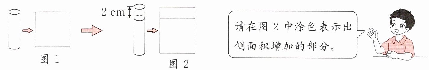 7 一个圆柱的侧面展开图是一个正方形,如图1。如果圆柱的高增加2厘米,那么圆柱的侧面积就增加12.56平方厘米,如图2。