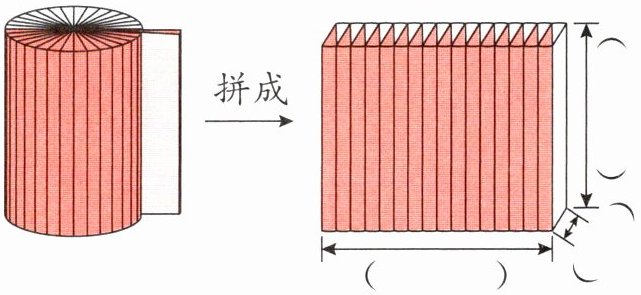 1 如图,将一个高为h、底面半径为r的圆柱平均分成若干份,然后拼成一个近似的长方体。