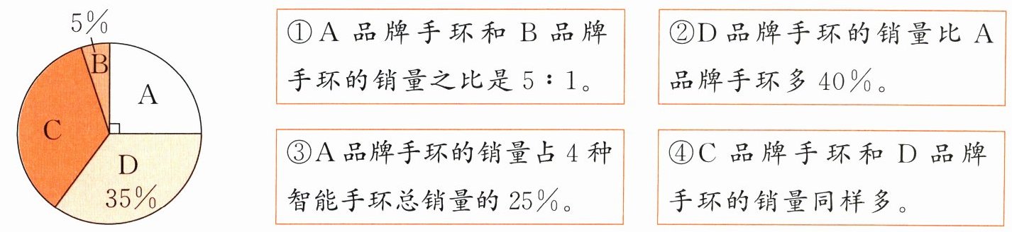 5. 智能手环可以记录日常生活中的锻炼、睡眠和饮食等数据,受到人们欢迎。某商场营销部统计了2025年4种品牌智能手环的销售情况,如下图。下面说法正确的有(