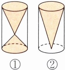 有两个等底等高的圆柱,将它们按照右图分别切割出与圆柱底面相同的圆锥,图①中两个圆锥的体积之和与图②中圆锥的体积相等吗?