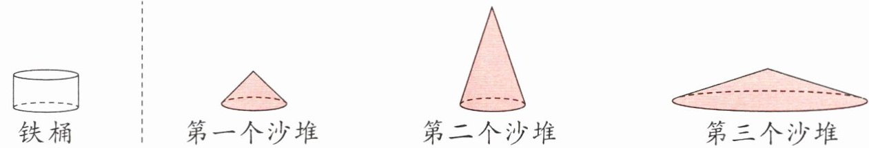 6 下面有一个圆柱形铁桶和三个圆锥形沙堆,在掌握了相关数据后,同学们开始讨论铁桶是否能分别装下每个沙堆。(铁桶厚度忽略不计)