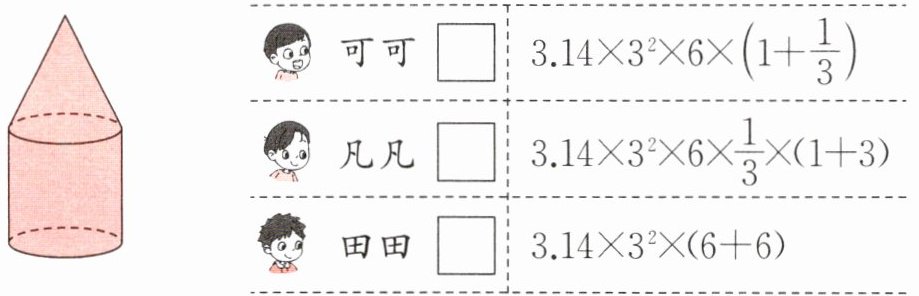 8 友谊路小学的航模小组制作了一个“火箭助推器”模型,它的上部是圆锥形的,下部是圆柱形的。圆柱和圆锥的底面半径都是3厘米,高都是6厘米。老师提出一个问题:“这个模型的体积是多少立方厘米?”下面是三位同学分别列出的算式: