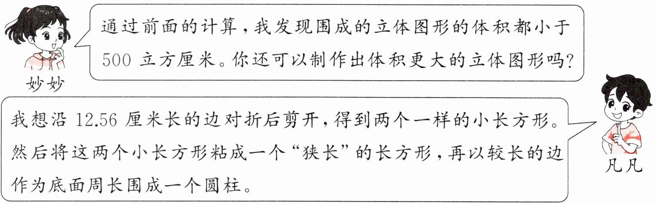 凡凡的想法是否可行呢?先在下图中标注出“狭长”的长方形的长和宽的数据,再计算围成的圆柱的体积(得数保留整数)。(重叠处忽略不计)