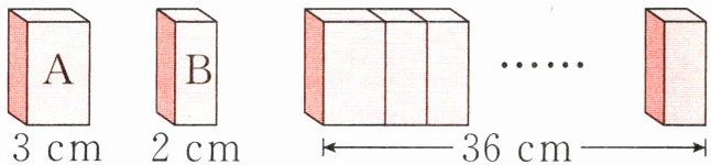 1. 如图,淘淘用 A、B 两种积木拼成一个大的长方体,已知大长方体的长是 36 厘米,他一共用了 15 块积木。用了 A、B 两种积木各多少块?