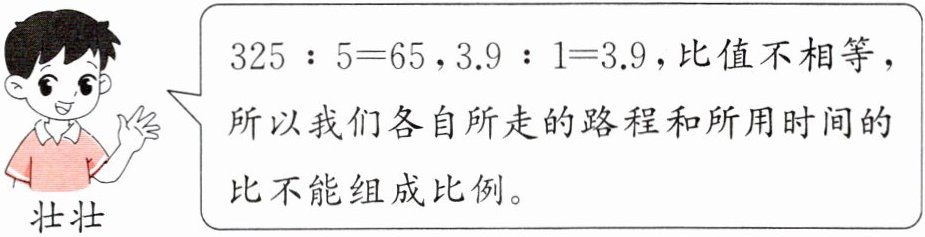 4. 答:壮壮的说法不正确,因为他没有将数量单位进行统一。$3.9$千米$=3900$米,$1$时$=60$分,$325:5=65$,$3900:60=65$,所以他们各自所走的路程和所用时间的比能组成比例。