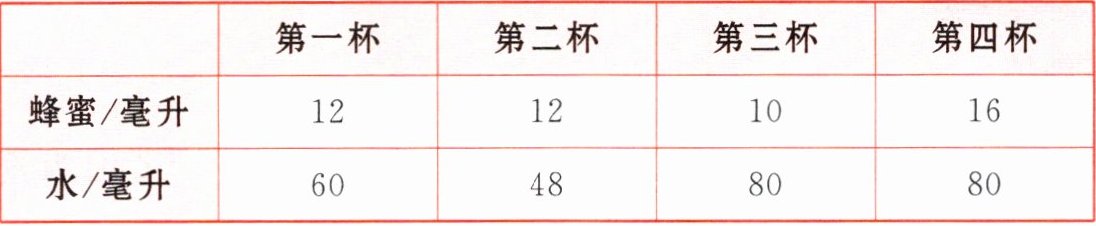 5 豆豆调制了4杯蜂蜜水,每杯所用的蜂蜜和水的体积情况如下表: