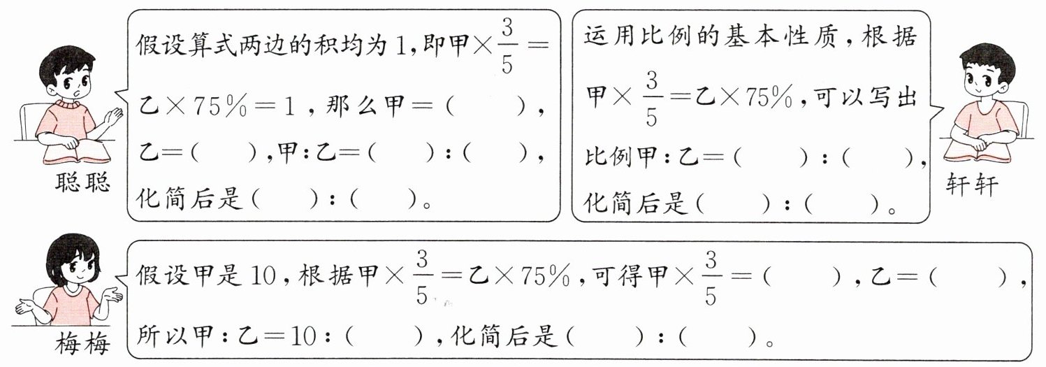8 已知甲的$$\frac{3}{5}$$和乙的$$75\%$$相等(甲、乙两数均不为0),则甲和乙的最简整数比是多少?聪聪、轩轩和梅梅都写出了等式“甲$$× \frac{3}{5} =$$乙$$× 75\%$$”,却有不同的思考。