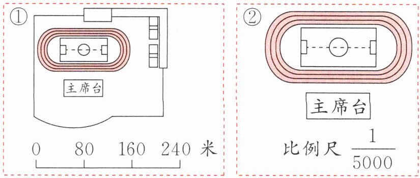 6. 80米=8000厘米 $\frac{1}{8000}:\frac{1}{5000}=5:8$ 答:图①与图②中主席台的周长的比是5:8。 解析 步骤一 可以设主席台的实际周长为“1”,图①的比例尺是1:8000,所以在图①中主席台的周长是$\frac{1}{8000}$。图②的比例尺是1:5000,所以在图②中主席台的周长是$\frac{1}{5000}$。 步骤二 求周长比。$\frac{1}{8000}:\frac{1}{5000}=5:8$。