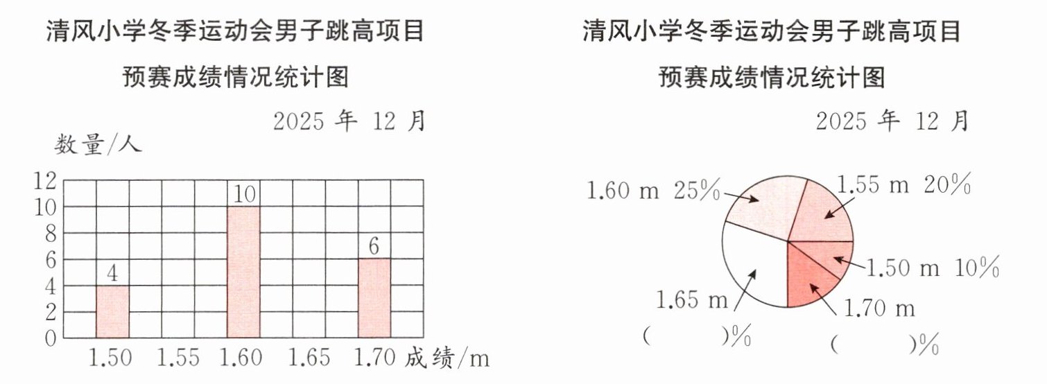 3 选手赛出水平,项目展现魅力,清风小学冬季运动会的男子跳高项目开展得如火如荼。下面是反映该项目预赛成绩情况的条形统计图和扇形统计图。