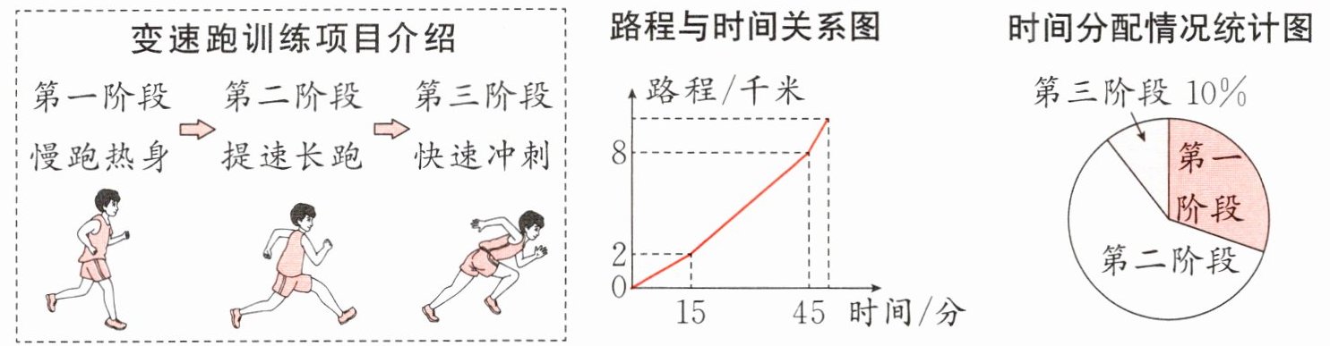 4 为了增强自身体身体素质,王叔叔开始了10千米变速跑训练。他用统计图记录了自己在一次变速跑训练中各阶段的路程情况和时间分配情况,如下: