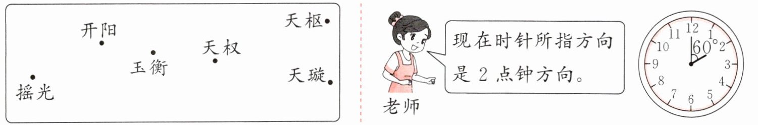 5 据古籍《鹖冠子》(“鹖”读 hé)记载,古人通过观察北斗七星的斗柄所指的方向来确定季节。下面左图是科学课上刘智画的北斗七星示意图,但是他漏画了天玑星,老师说:“天玑星在玉衡星的 4 点钟方向,天权星在天玑星的 11 点钟方向。”你能帮他补全吗?