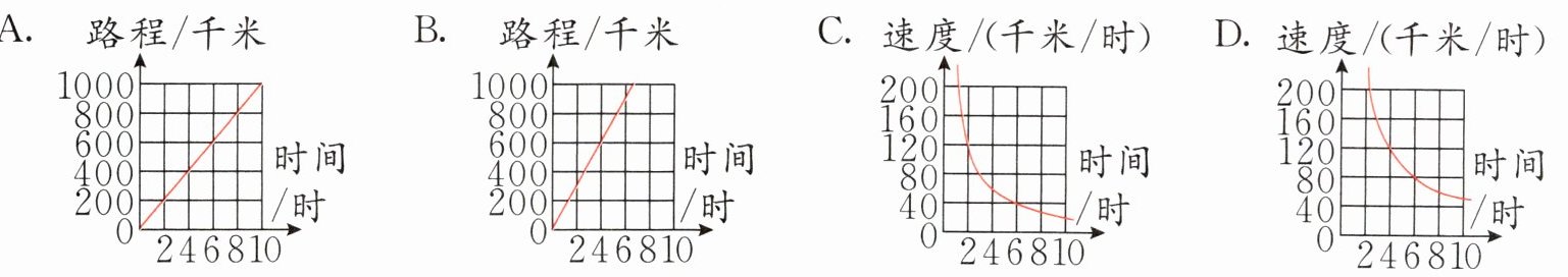 (1)题,①对应反比例图像,速度和时间的积是不变量,且行驶6小时对应速度为80千米/时,选D;②对应正比例图像,速度是不变量,4小时对应400千米,选A。