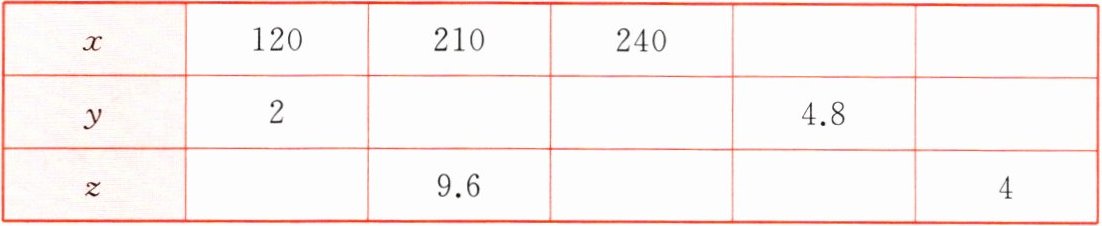 1. 已知 $ x $ 和 $ y $ 成正比例,$ y $ 和 $ z $ 成反比例。请把下表补充完整。